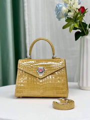 Womens Beige Shiny Crocodile Leather Top Handle Cross Body Bag