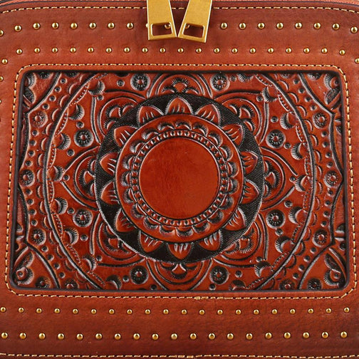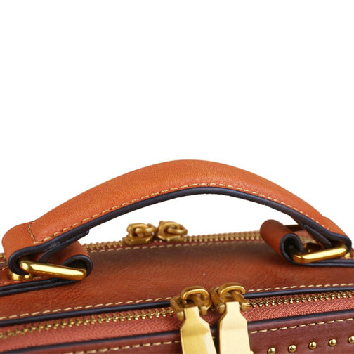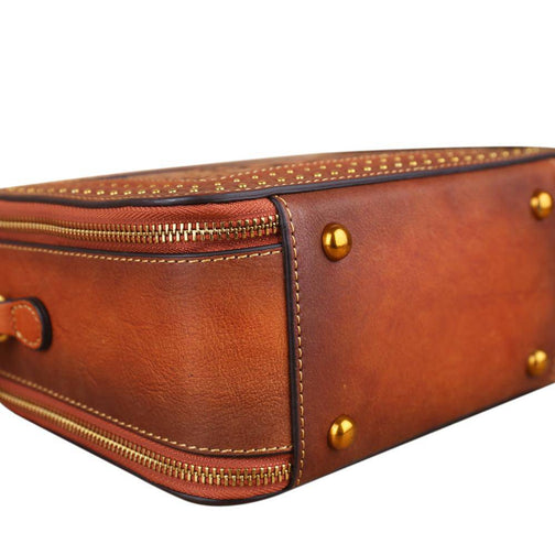 This is a compact single top handle purse and long cross body strap. It closes with zipper closure around . It has an open interior with Hand-selected, tumbled, vege distressed top grade of cowhilde leather with antique golden tone hardware.