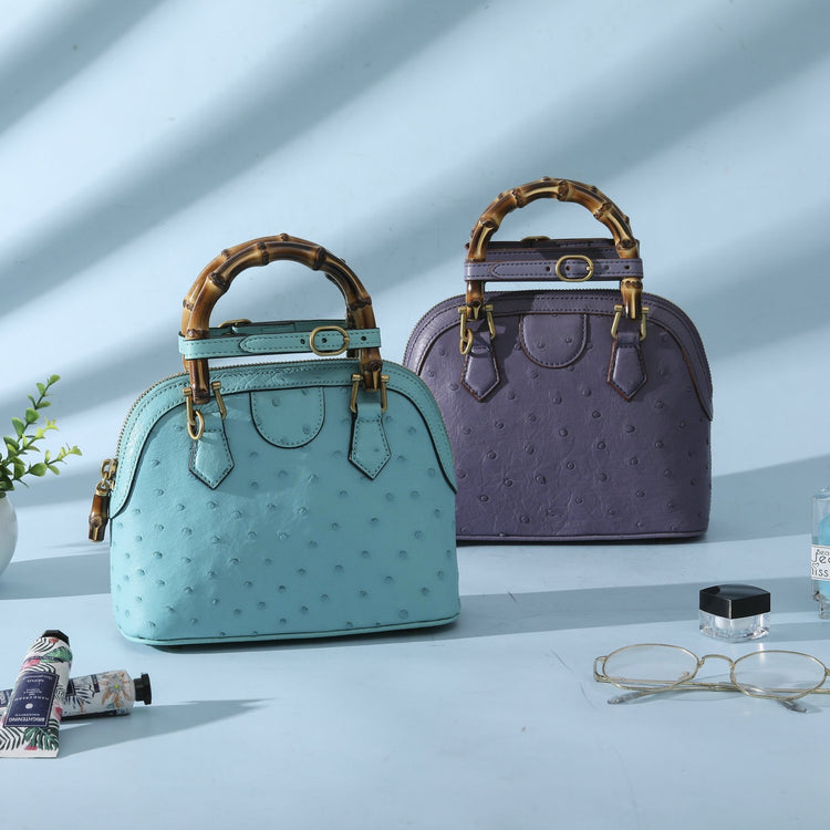 Ostrich Leather Mini Shell Bag Bamboo Handle Top Handle Cross Body Handbag
