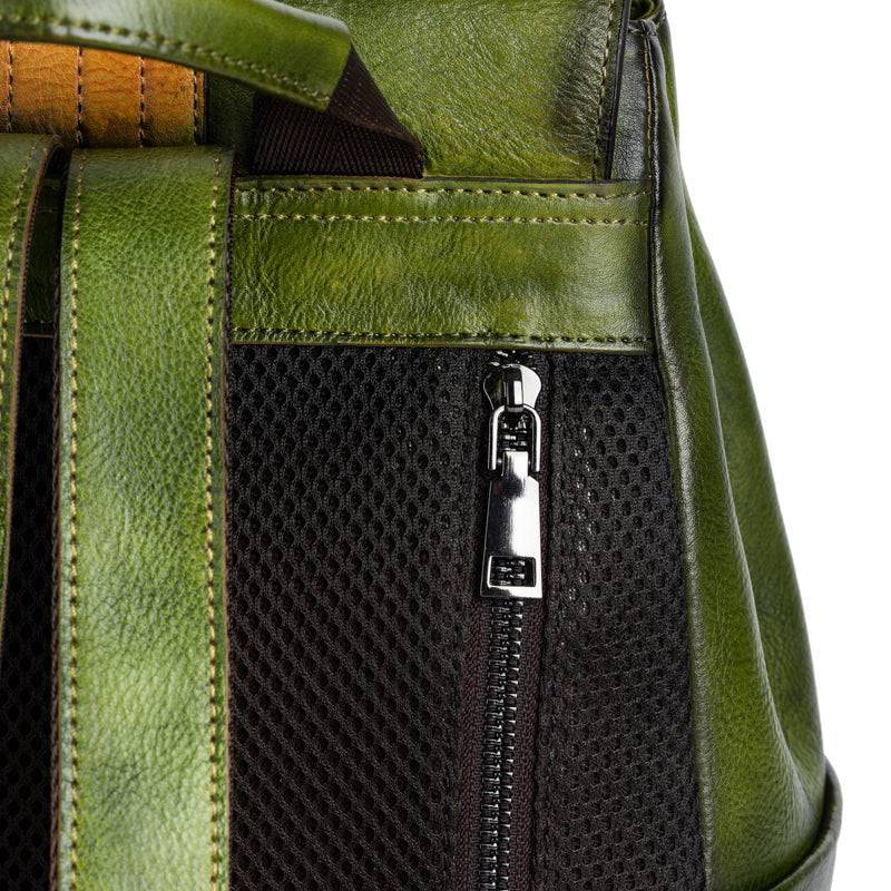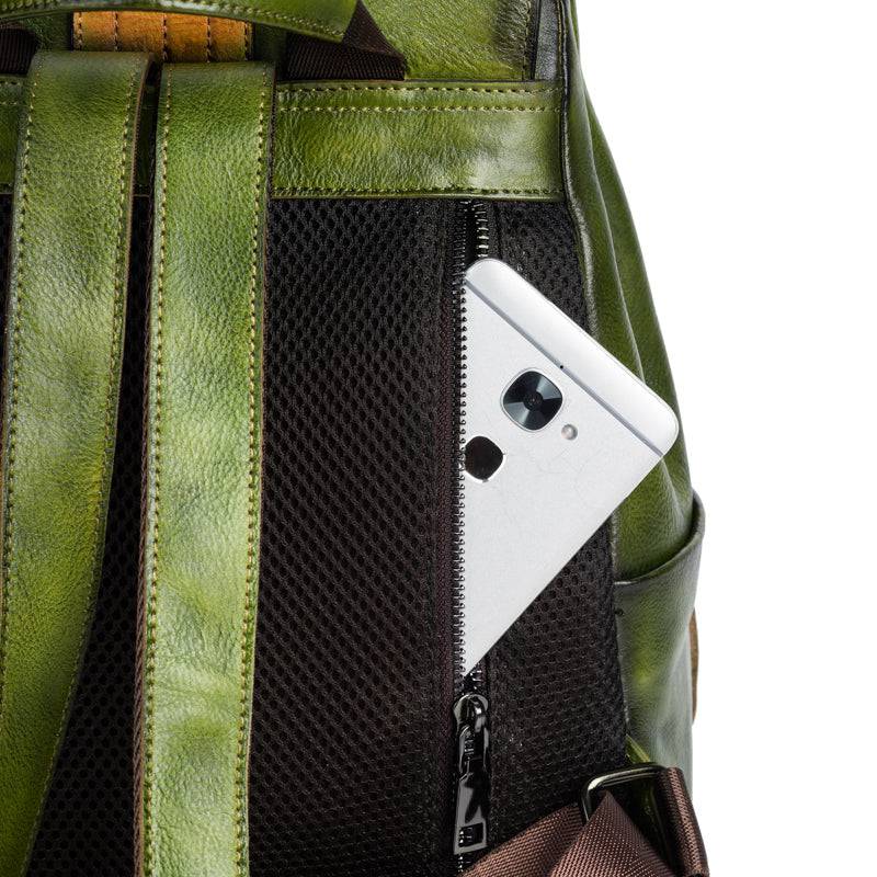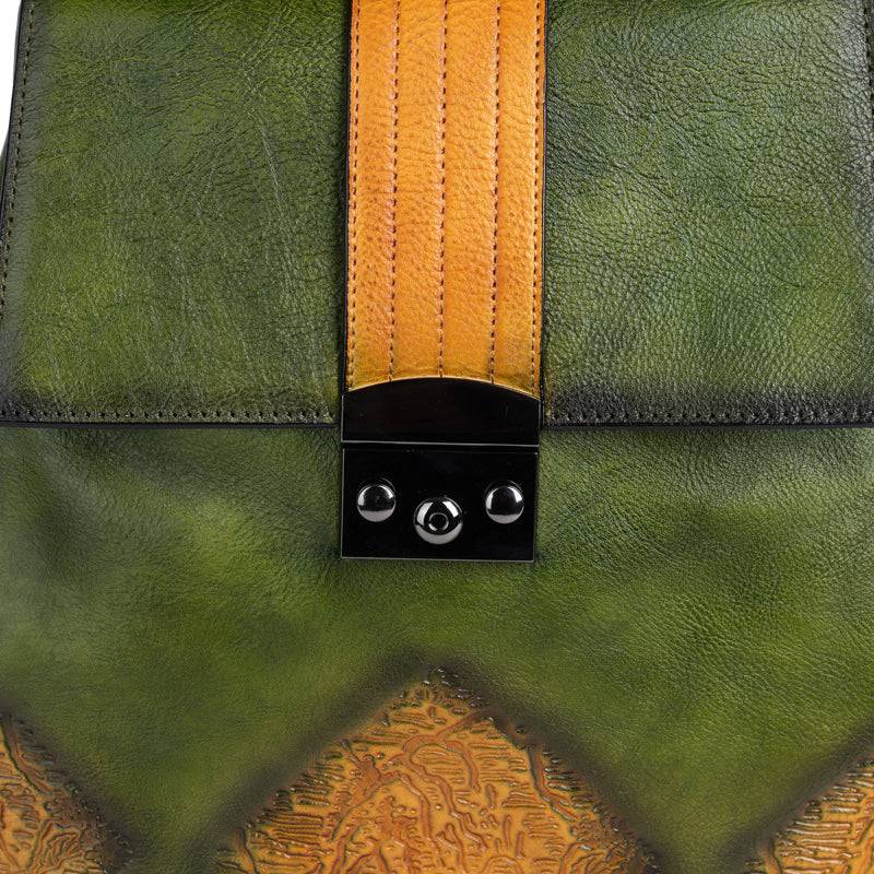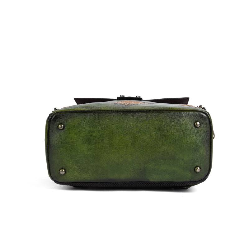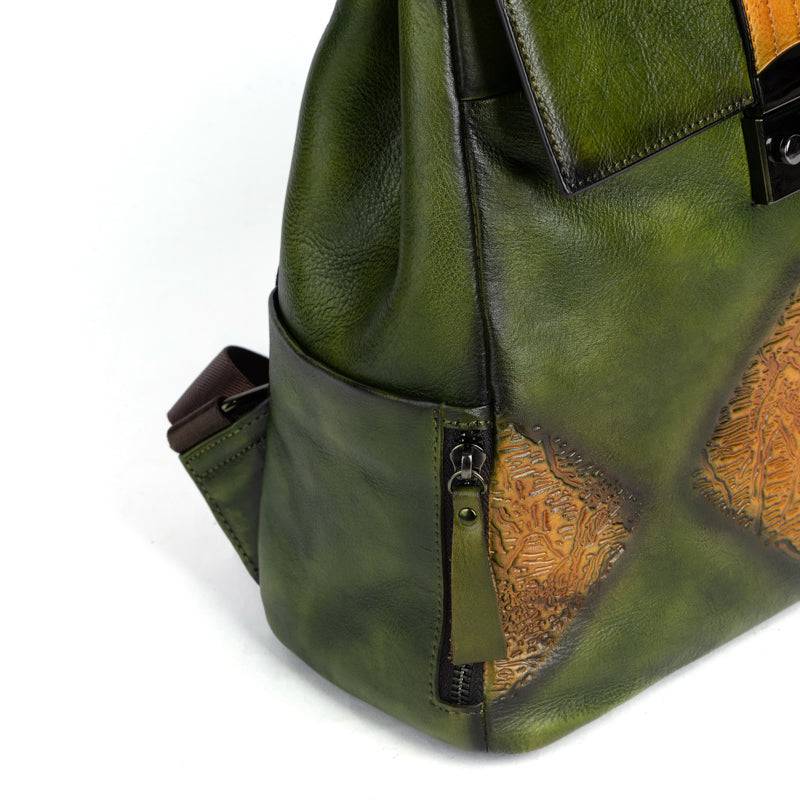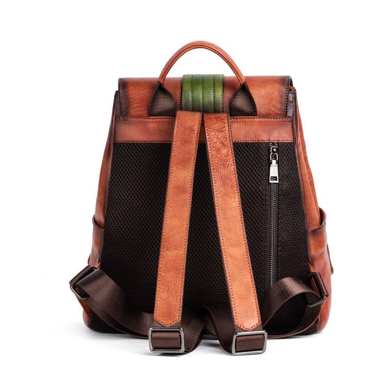 This backpack is with Hand-selected, tumbled, grainy top grade of cowhild leather with gunmetal tone hardware. Engraved colorful brick square design at front, Destined to become your favorite daily and special bag, Our handmade vintage leather line delivers a unique alternative to the fashion style for our royal customer .
