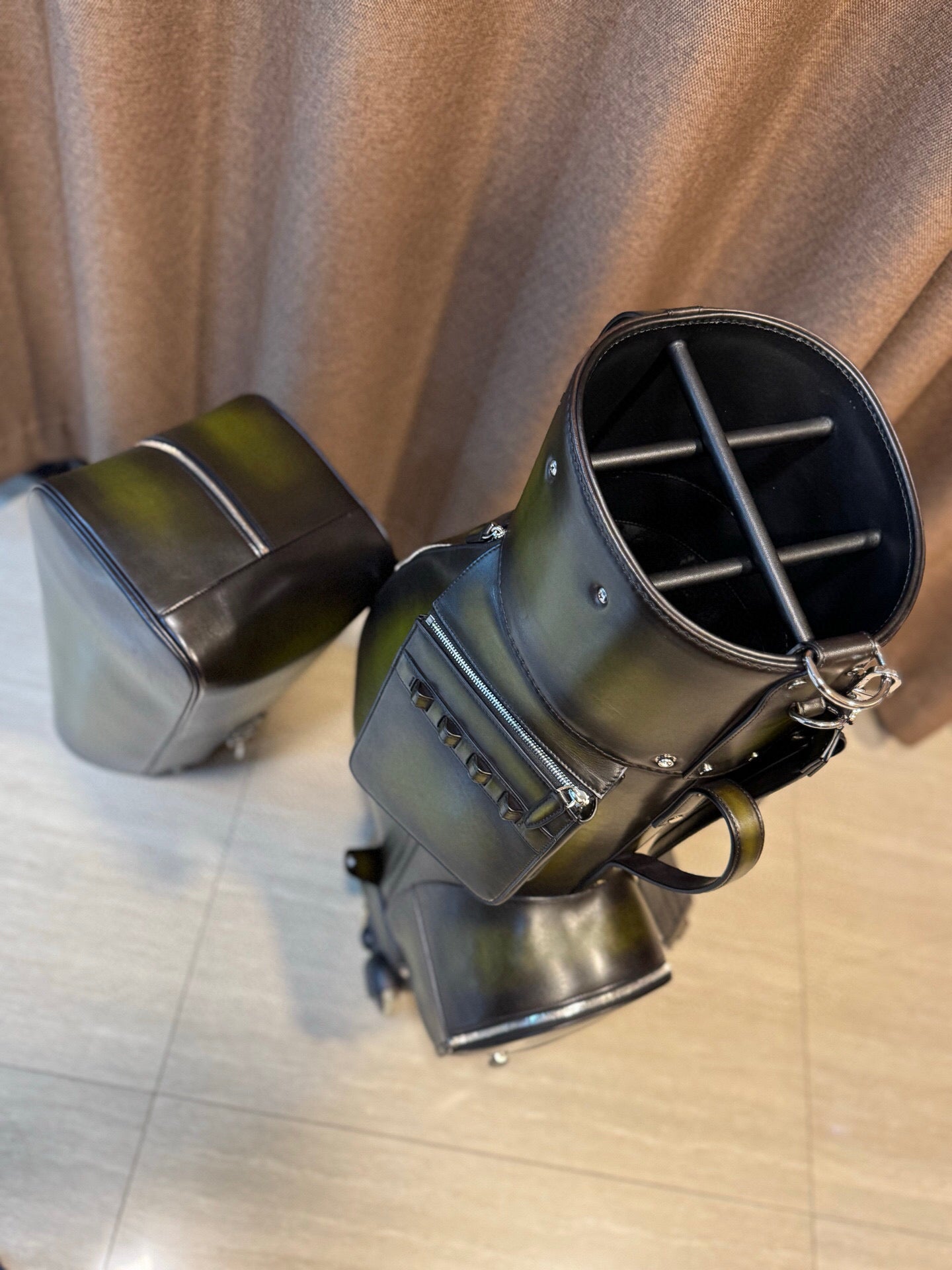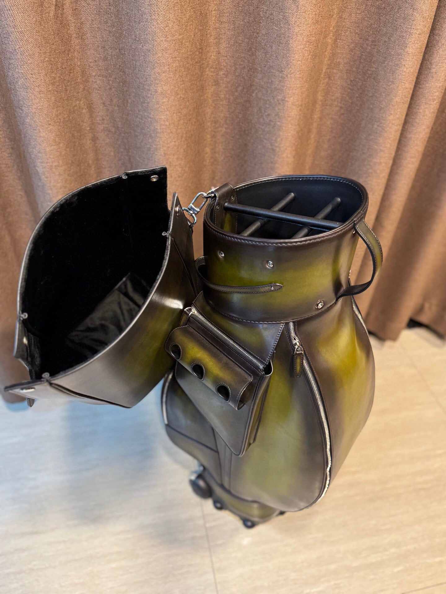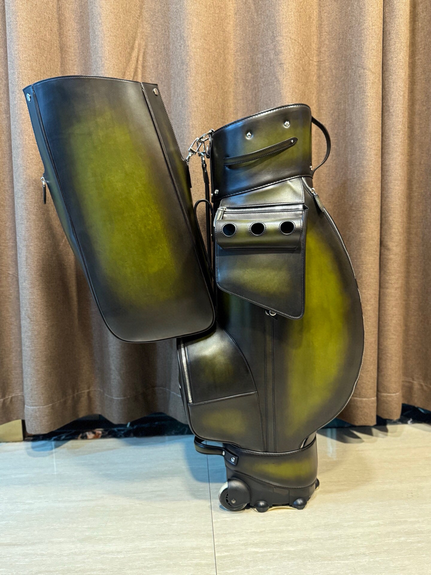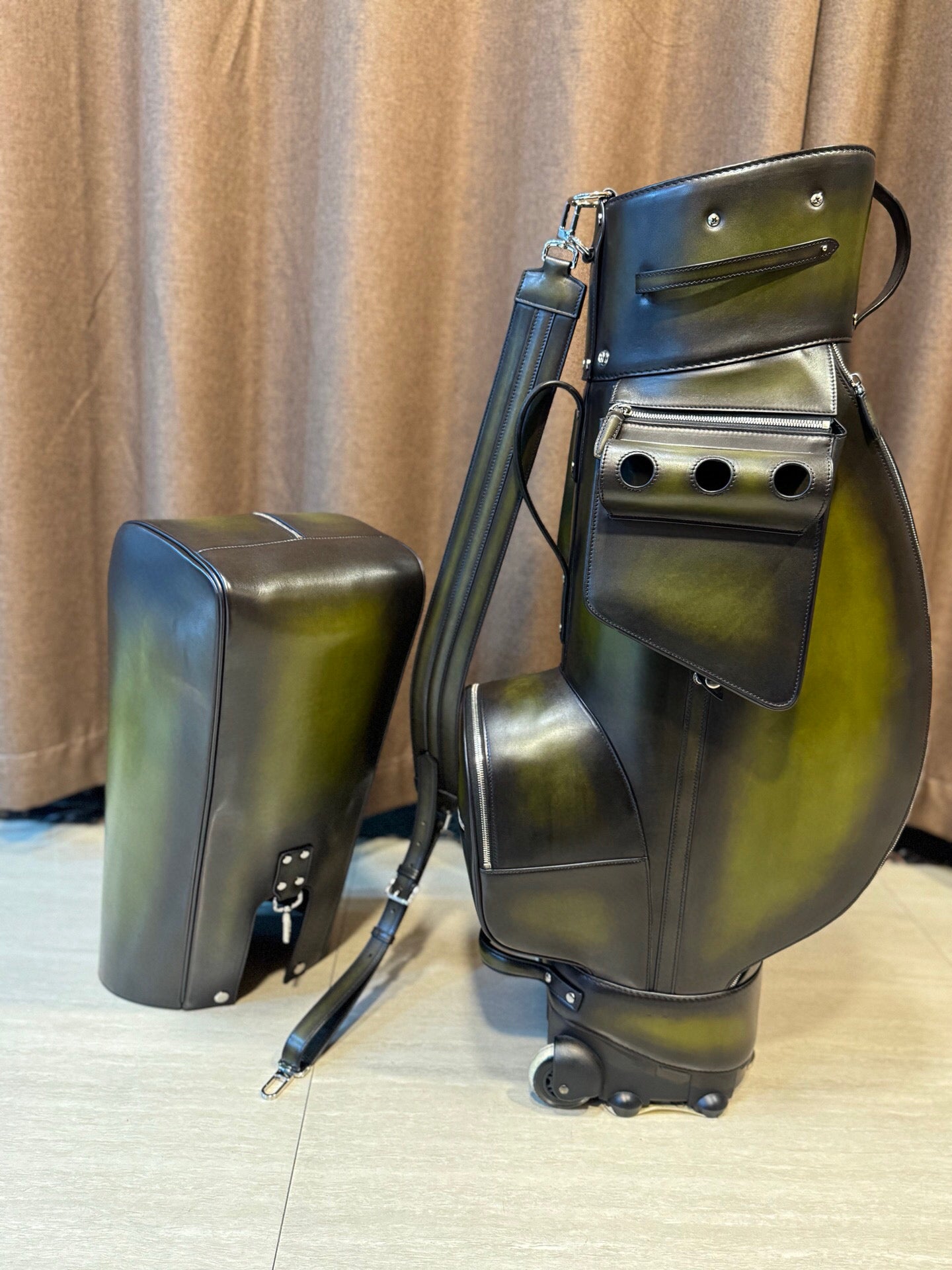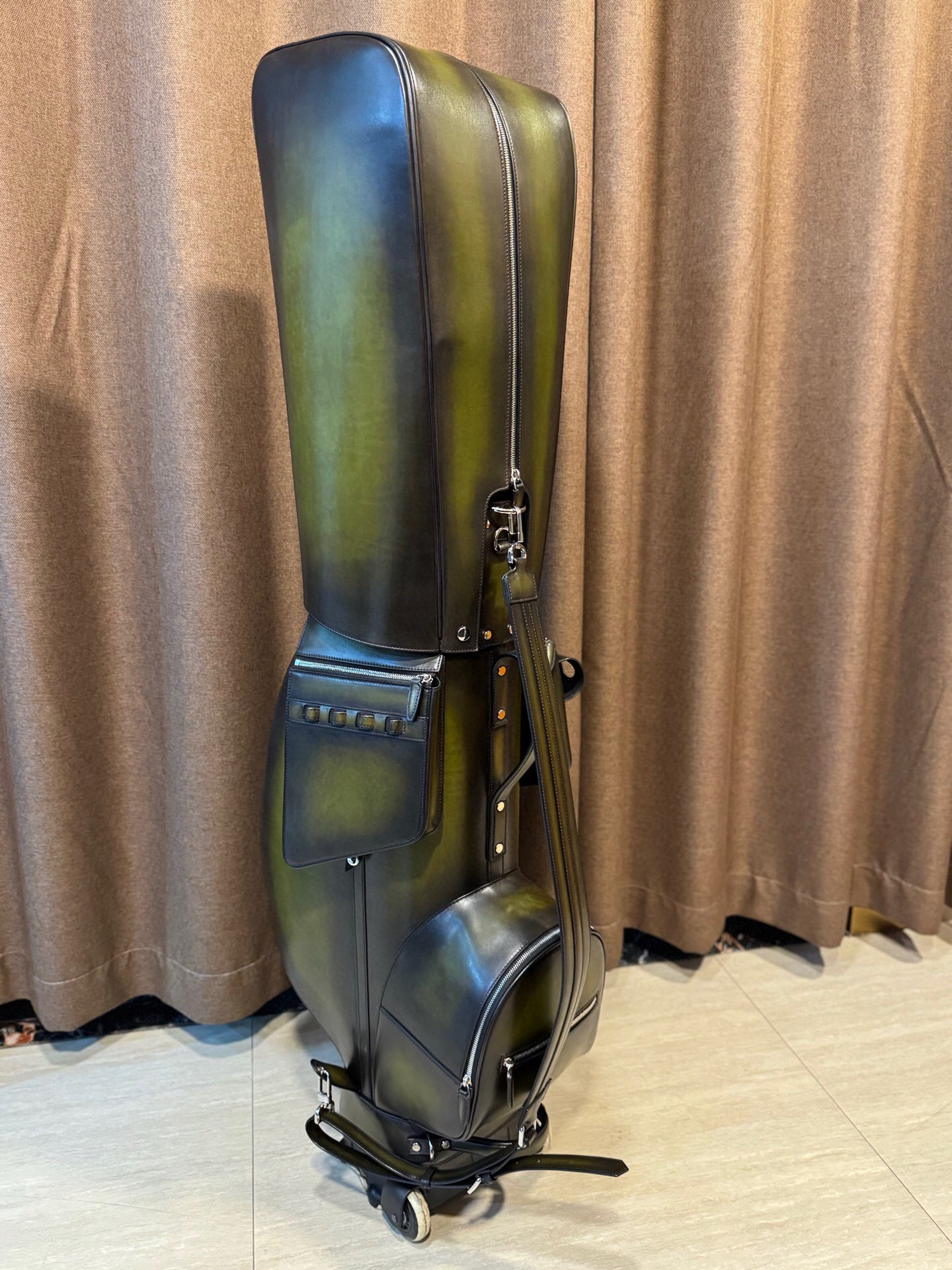 This luxury bag is with super imported vintage smooth Dutch cowhide leather golf bag with silver hardware.