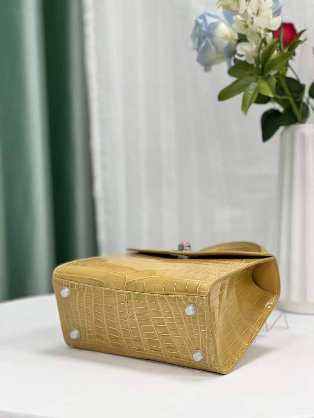 Womens Beige Shiny Crocodile Leather Top Handle Cross Body Bag