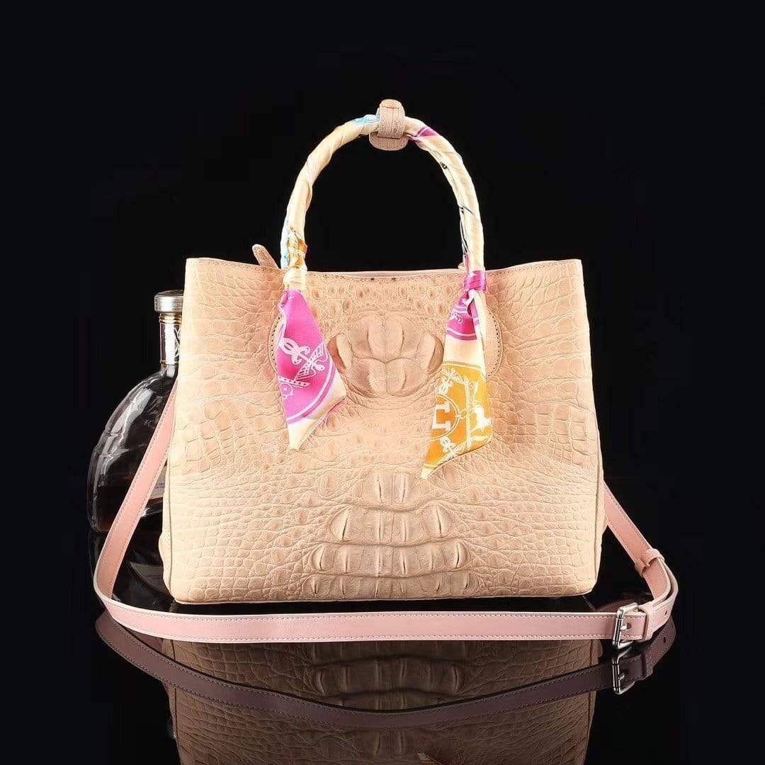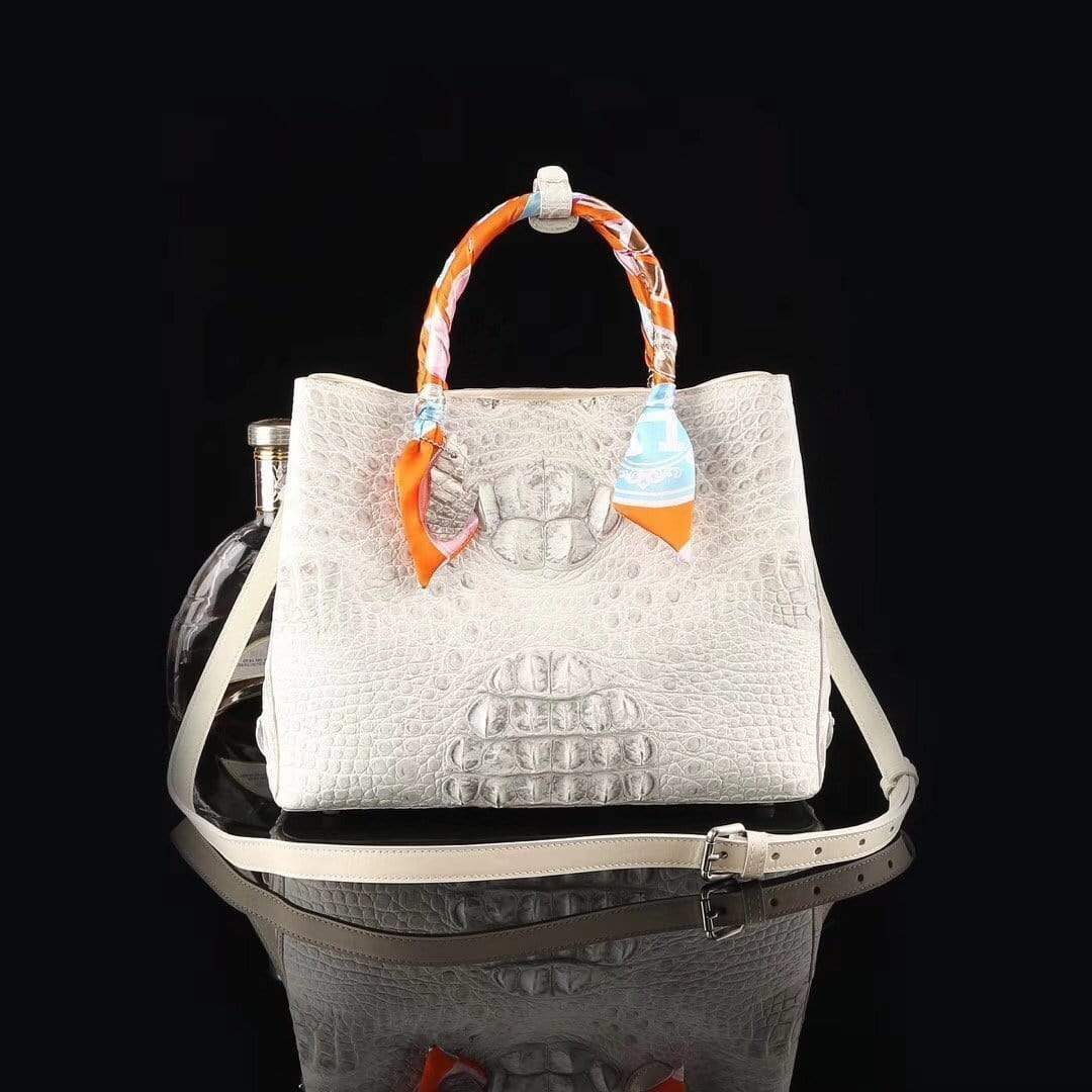 Exotic beautiful crocodile skin bone Leather with polished silver-tone hardware; Double rolled crocodile leather top handle;Top zipper closure;Detachable and adjustable shoulder strap with lanyard clasp fastening; One interior zip pocket,one interior slip pocket and one phone slot;imported calfskin leather lining;Come with dust bag ,tags.