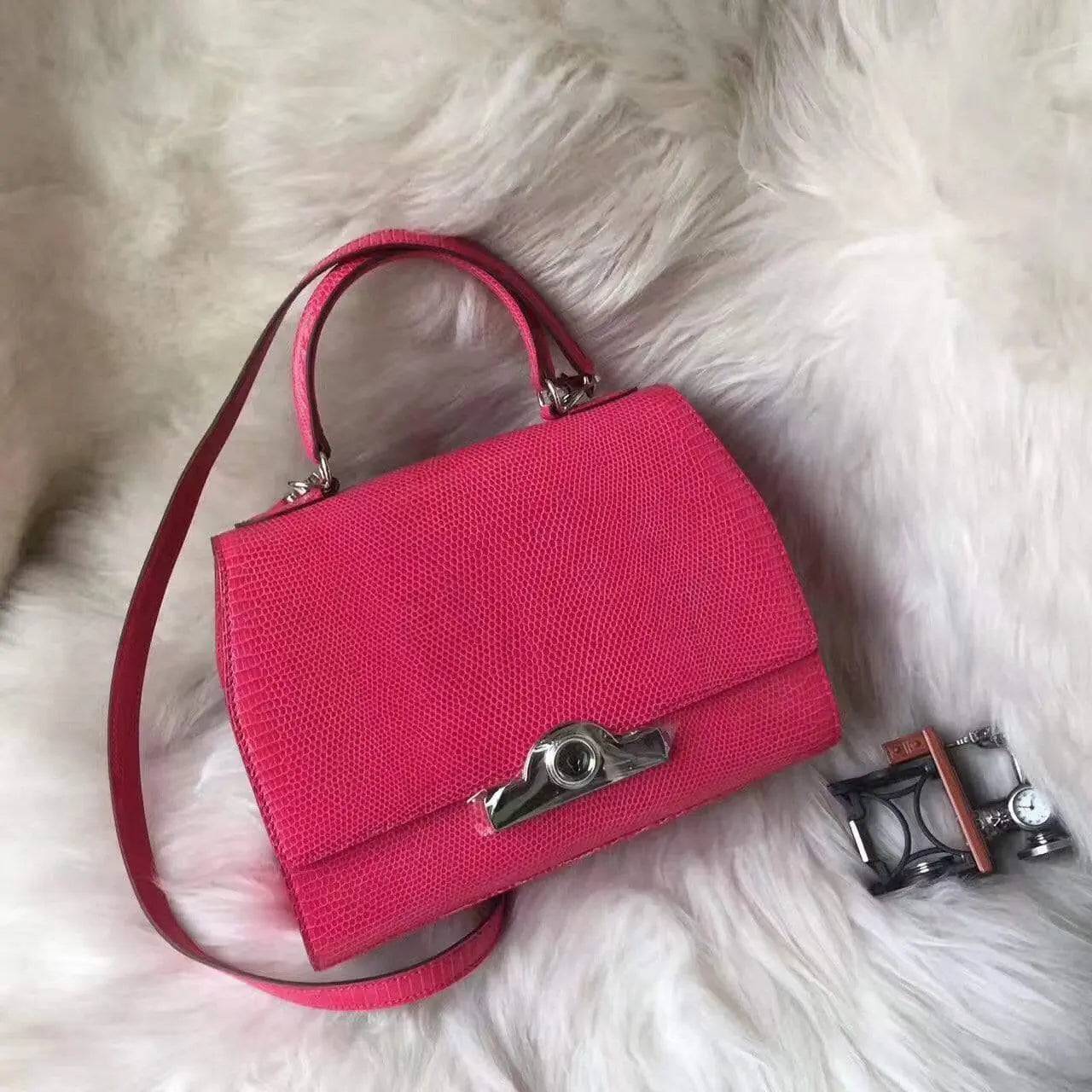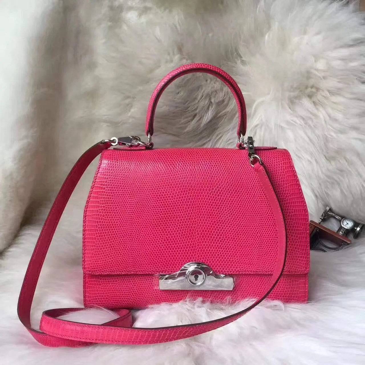 - Beautiful exotic lizard skin leather with palladium hardware.